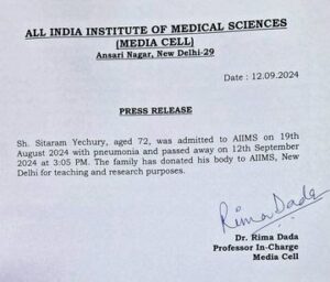 भारतीय कम्युनिस्ट पार्टी (मार्क्सवादी) के महासचिव सीताराम येचुरी का आज गुरुवार 12 सितंबर को निधन हो गया। वे सांस की गंभीर बीमारी से जूझ रहे थे, अखिल भारतीय आयुर्विज्ञान संस्थान (एम्स) में करीब एक महीने से वह भर्ती थे।