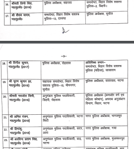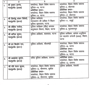एसडीपीओ पटना सिटी अमित रंजन को नगर पुलिस अधीक्षक भागलपुर, आरा सदर के एसडीपीओ हिमांशु को नगर पुलिस अधीक्षक गया, बाढ़ के एसडीपीओ अरविंद प्रताप सिंह को नगर पुलिस अधीक्षक मुजफ्फरपुर बनाया गया है. वहीं सहायक पुलिस अधीक्षक विधि व्यवस्था गया भारत सोनी को एसडीपीओ बाढ़, चकिया के एसडीपीओ शरद आर. एस. को अनुमंडल पुलिस पदाधिकारी पटना सिटी और रजौली के एसडीपीओ विक्रम सिहाग को एसडीपीओ फुलवारीशरीफ के पद पर पदस्थापित किया गया है.