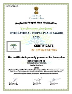 मधेपुरा ब्यूरो/मधेपुरा जिले के चौसा निवासी चर्चित साहित्यकार,समाजसेवी सह पर्यावरण प्रेमी संजय कुमार सुमन को रघुराज पीपल मैन फाउंडेशन के सीईओ डॉ. रघुराज सिंह ने “इंटनेशनल पीपल पीस आवर्ड” से सम्मानित किया है। श्री सुमन के इस सम्मान से सामाजिक कार्यकर्ताओं एवं राजनीतिक कार्यकर्ताओं में काफी हर्ष देखा जा रहा है।