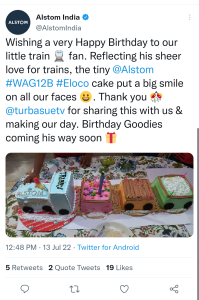 ट्रेन के प्रति दिवानगी को देख Alstom ने भी खुशी जाहिर किया है और Alstom India के वेरिफाइड ट्विटर हैंडल से इसे शेयर किया है और लिखा है हमारी नन्हे रेलगाड़ी के प्रशंसक को जन्मदिन की बहुत-बहुत बधाई। @Alstom #WAG12B #Eloco केक ने हम सभी के चेहरों पर एक बड़ी मुस्कान ला दी। इसे हमारे साथ साझा करने और हमारा दिन बनाने के लिए @turbasuetv को धन्यवाद। जन्मदिन की शुभकामनाएं….