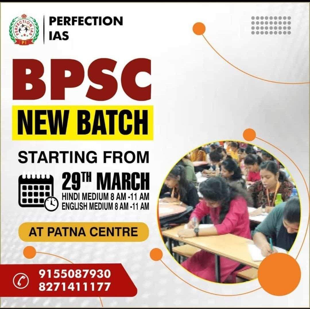 पटना/ देश की अग्रणी बीपीएससी परीक्षा की  तैयारी कराने संस्थान में शुमार परफेक्शन आईएएस मार्च महिने में अपने दिल्ली सेंटर और बिहार सेंटर पर नये बैच की शुरूआत करने जा रहा है इसी क्रम में बीपीएससी (इंग्लिश मीडियम) के छात्रों के लिये परफेक्शन आईएएस के द्वारा आगामी  15 मार्च एवं 22 मार्च को नये बैच