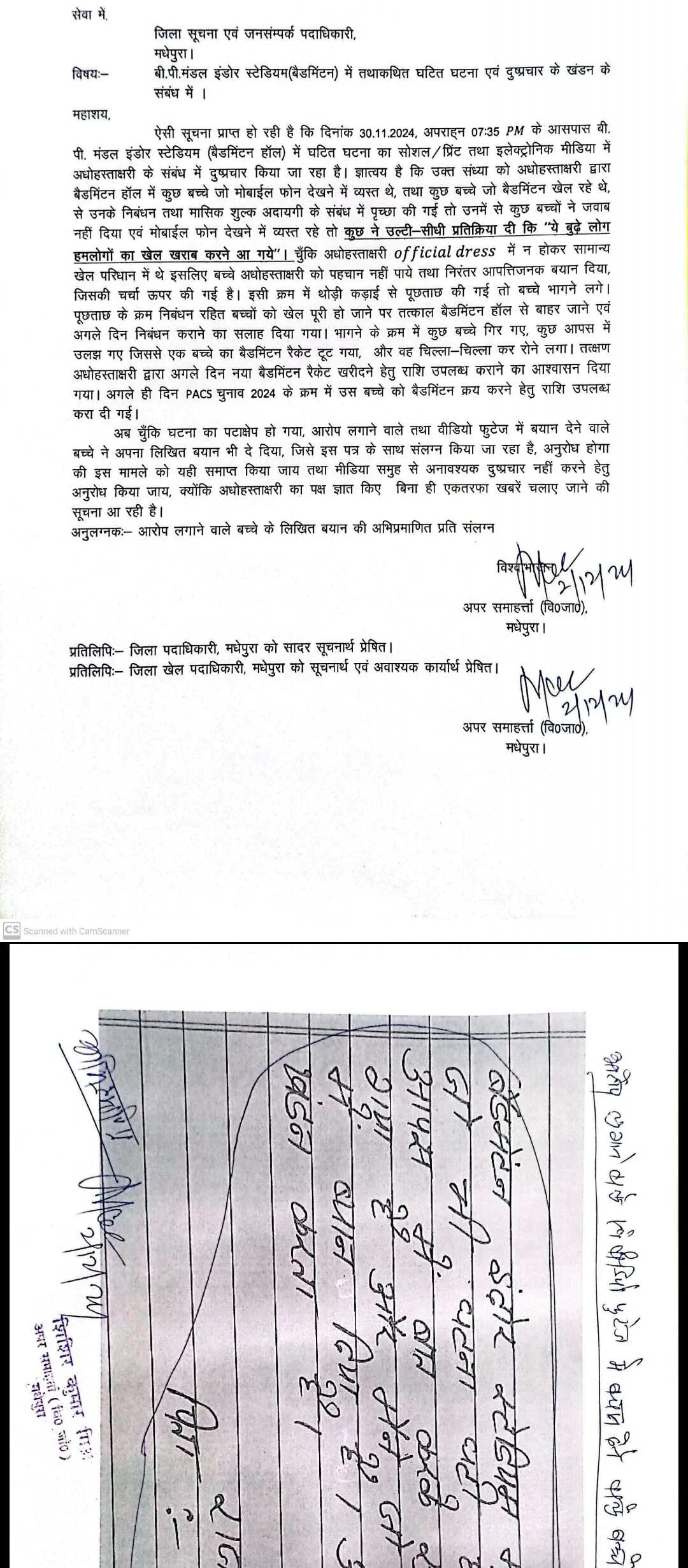 एडीएम साहब के पत्र के साथ पीड़ित खिलाड़ी राज कुमार का भी एक पांच पंक्ति का पत्र संलग्न किया गया है जिसमें लिखा गया है कि बैडमिंटन इनडोर स्टेडियम में रात को जो भी घटना घटी है उसे आपस में बात करके सुलझा लिया गया है और मैंने जो भी वीडियो में बयान दिया है उस वीडियो का खंडन करता हूं।