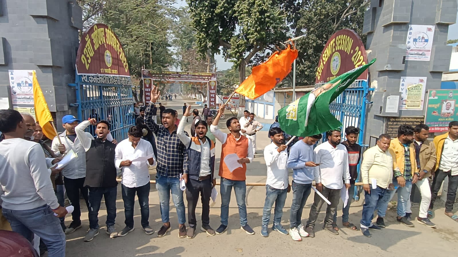 मधेपुरा/ भूपेंद्र नारायण मंडल विश्वविद्यालय में सीनेट बैठक से पूर्व काफी वह हंगामा हो रहा है ।मुख्य द्वार को विभिन्न छात्र संगठनों के कार्यकर्ताओं के द्वारा जाम कर दिया गया है जहां सीनेट के सदस्यों को अंदर प्रवेश नहीं करने दिया जा रहा है इस कड़ी में विश्वविद्यालय के कुलपति प्रोफेसर आरकेपी रमन भी फंसे हुए ही हैं छात्रों का विरोध उन्हें झेलना पड़ रहा है।