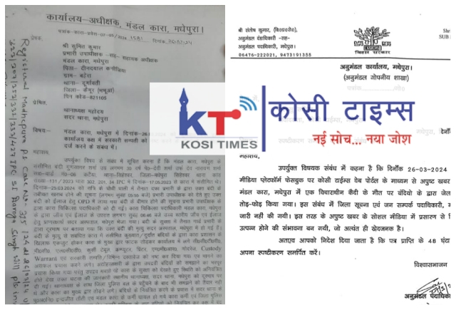 स्पष्टीकरण मांगने से पहले जांच तो कर लेते… : घटना सही थी और कोसी टाइम्स द्वारा जारी की गई खबर भी पुष्ट और सही थी। इस संबंध में मधेपुरा थाना में 21 कैदियों पर मामला भज दर्ज कराया गया। दोपहर करीब एक बजे खबर जारी हुई और उसी दिन शाम या रात में चिन्हित कैदियों पर मामला दर्ज करवाया गया।एफआईआर में घटना से जुड़ी उन तथ्यों का उल्लेख भी है जिसे कोसी टाइम्स ने जारी किया था।ऐसे में जब कोसी टाइम्स की खबर पुष्ट और सही है फिर एसडीएम साहब बौखला क्यों गए ? क्या साहब के मनमाफिक कोसी टाइम्स ने खबर नहीं चलाई या खबर को नहीं दबाया तो साहब नाराज हो गए ? साहब का पावर कम हो गया ?