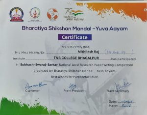भागलपुर प्रतिनिधि/पाटलिपुत्र विश्वविद्यालय के गंगा देवी महिला महाविद्यालय में भारतीय शिक्षण मंडल के बैनर तले आयोजित राज्यस्तरीय सुभाष स्वराज सरकार शोध पत्र लेखन प्रतियोगिता में अंगप्रदेश लाल युवा साहित्यकार मिथिलेश आनंद ने भागलपुर का प्रतिनिधित्व करते हुए प्रथम स्थान प्राप्त जिया है। इस प्रतियोगिता में बिहार के सभी जिलों से कुल 150 प्रतिभागियों ने भाग लिया एवम विभिन्न विषयों पर अपने शोध पत्र प्रस्तुत किया ।