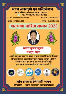 मधेपुरा ब्यूरो/मधेपुरा जिले के चौसा प्रखंड के चर्चित युवा साहित्यकार सह नेशनल जर्नलिस्ट एसोसिएशन के राष्ट्रीय महासचिव संजय कुमार सुमन को संगम अकादमी एवं पब्लिकेशन कोटा, राजस्थान के द्वारा साहित्य क्षेत्र में उत्कृष्ट योगदान देने के लिए ‘मातृभाषा साहित्य सम्मान’ से सम्मानित किया गया है। यह सम्मान उन्हें मातृभाषा दिवस के शुभ अवसर पर आज 21 फरवरी को प्रदान किया गया है। जिसमें युवा साहित्यकार श्रीसुमन सम्मान समारोह में शामिल नहीं जा सके तो उन्हें यह सम्मान पत्र डाक द्वारा भेजा गया है। इस सम्मान में विभिन्न क्षेत्रों के 65 नामचीन साहित्यकारों, कवियों,पत्रकारों को शामिल किया गया है।
