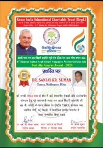 पूर्व प्रधानमंत्री भारत रत्न अटल बिहारी वाजपेई की 100 वीं जयंती के पावन अवसर पर राष्ट्रीय वाईएमसीए सम्मेलन कक्ष जयसिंह मार्ग, नई दिल्ली में ग्रेस इंडिया एजुकेशन चैरिटेबल ट्रस्ट की ओर से सम्मान समारोह का आयोजन किया गया।जिसमें मधेपुरा जिले के चौसा निवासी साहित्यकार,समाजसेवी सह पर्यावरण प्रेमी संजय कुमार सुमन को “बेस्ट अटल गौरव अवॉर्ड 2024″से सम्मानित किया है। श्री सुमन के इस सम्मान से सामाजिक कार्यकर्ताओं एवं राजनीतिक कार्यकर्ताओं में काफी हर्ष देखा जा रहा है।
